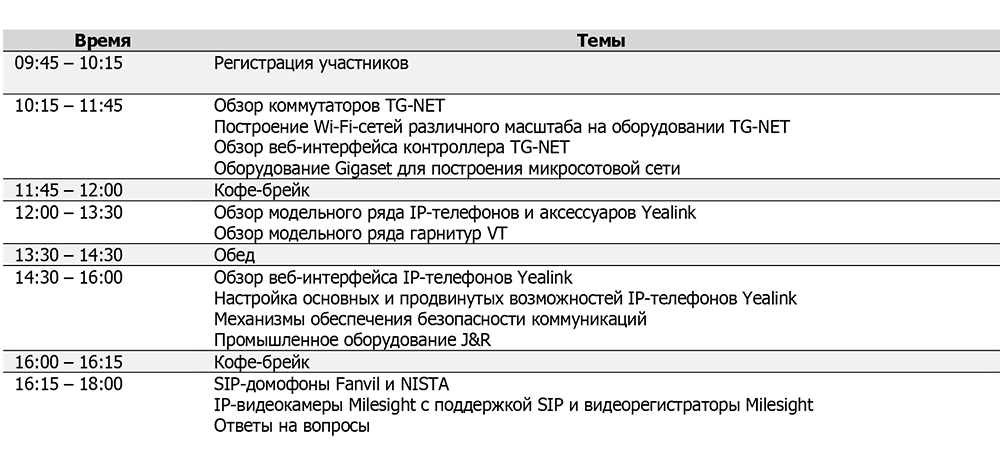 11 сентября состоится конференция, посвященная продуктам для построения телекоммуникационных сетей. В ходе встречи будут рассмотрены IP-телефоны и АТС, ВКС-системы, программное обеспечение, видеонаблюдение и многое другое. Участников мероприятия ждут подробные презентации о новых разработках и решениях Yealink, Yeastar, 3СХ, TG-NET, Wi-Tek, а также обзор других брендов.