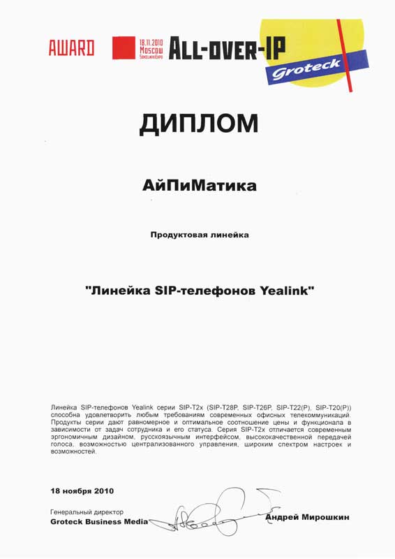 По итогам выставки и форума, линейка SIP-телефонов Yealink серии SIP-T2x (SIP-T28P, SIP-T26P, SIP-T22(P), SIP-T20(P)) получила специальный диплом.