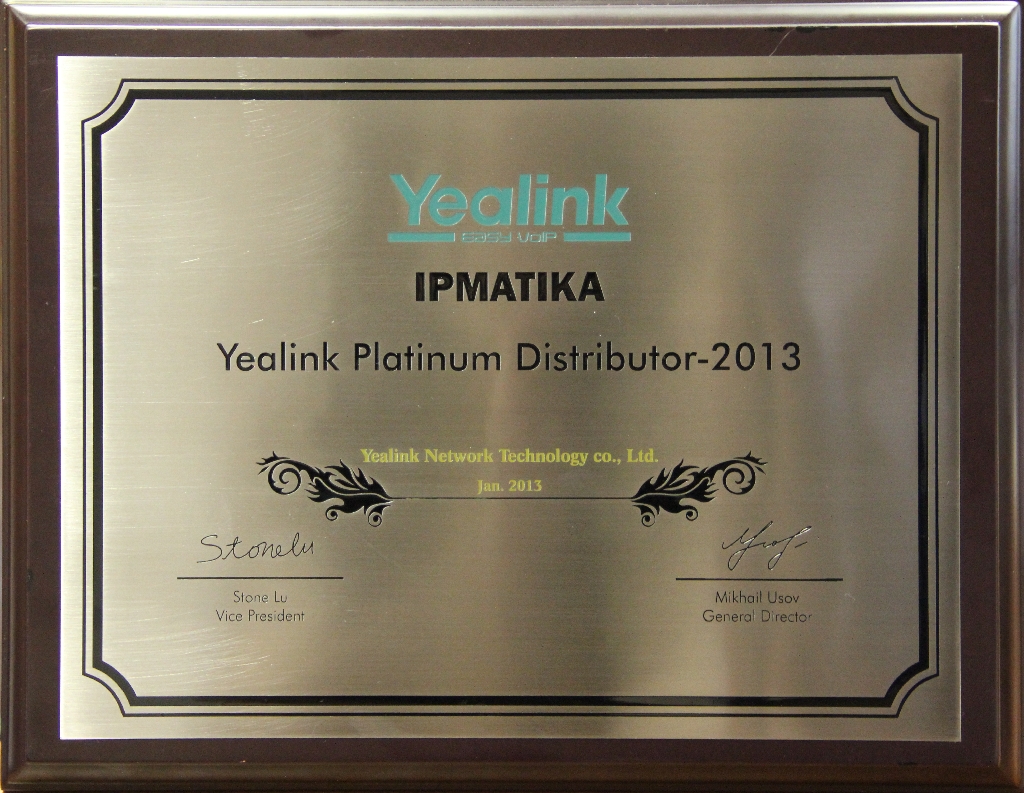 По итогам работы 2012 года компания "АйПиМатика" получила статус платинового диcтрибьютора компании Yealink Network Technology Co., Ltd.