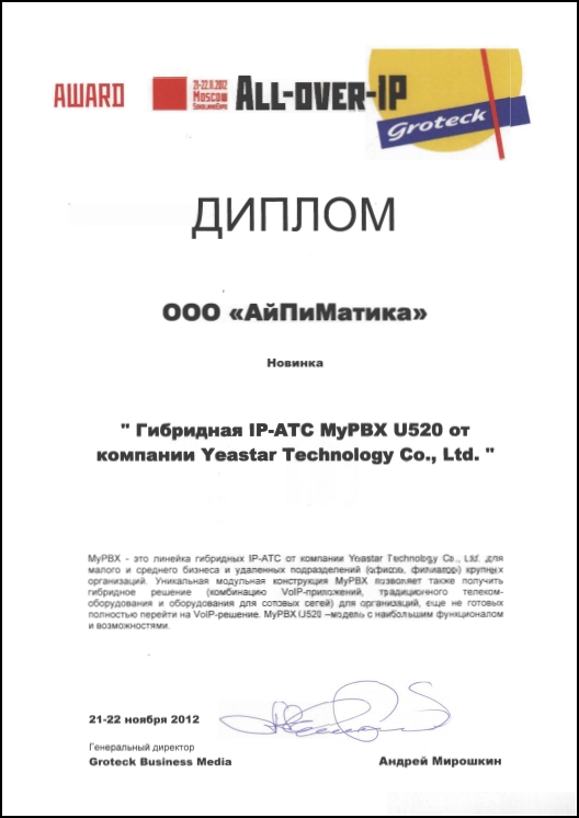 В рамках мероприятия ООО "АйПиМатика" была награждена специальным дипломом за инновационные решения, представленные на   5-ом международном форуме All-over-IP 2012 :