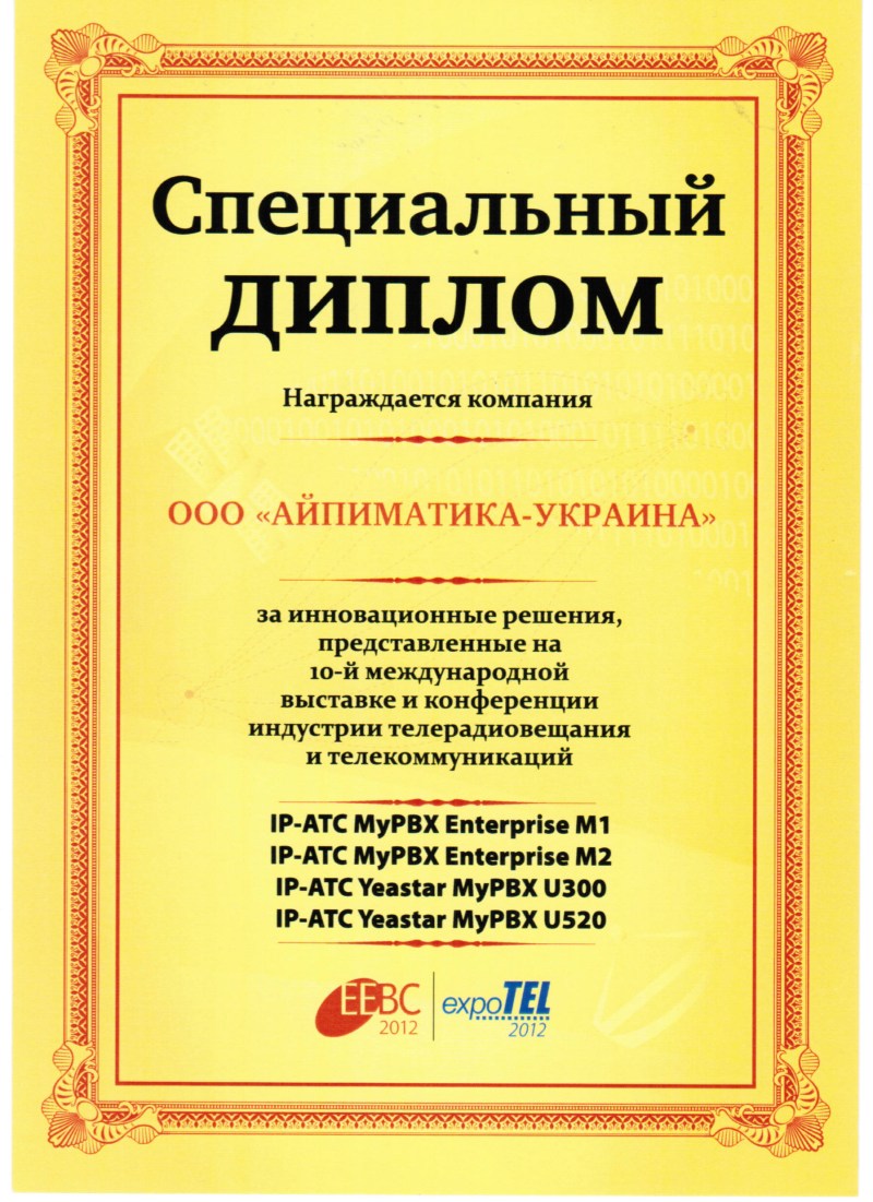 Кроме того ООО "АйПиМатика-Украина" была награждена специальным дипломом за инновационные решения, представленные на 10-ой международной выставке и конференции индустрии телерадиовещания и телекоммуникаций: