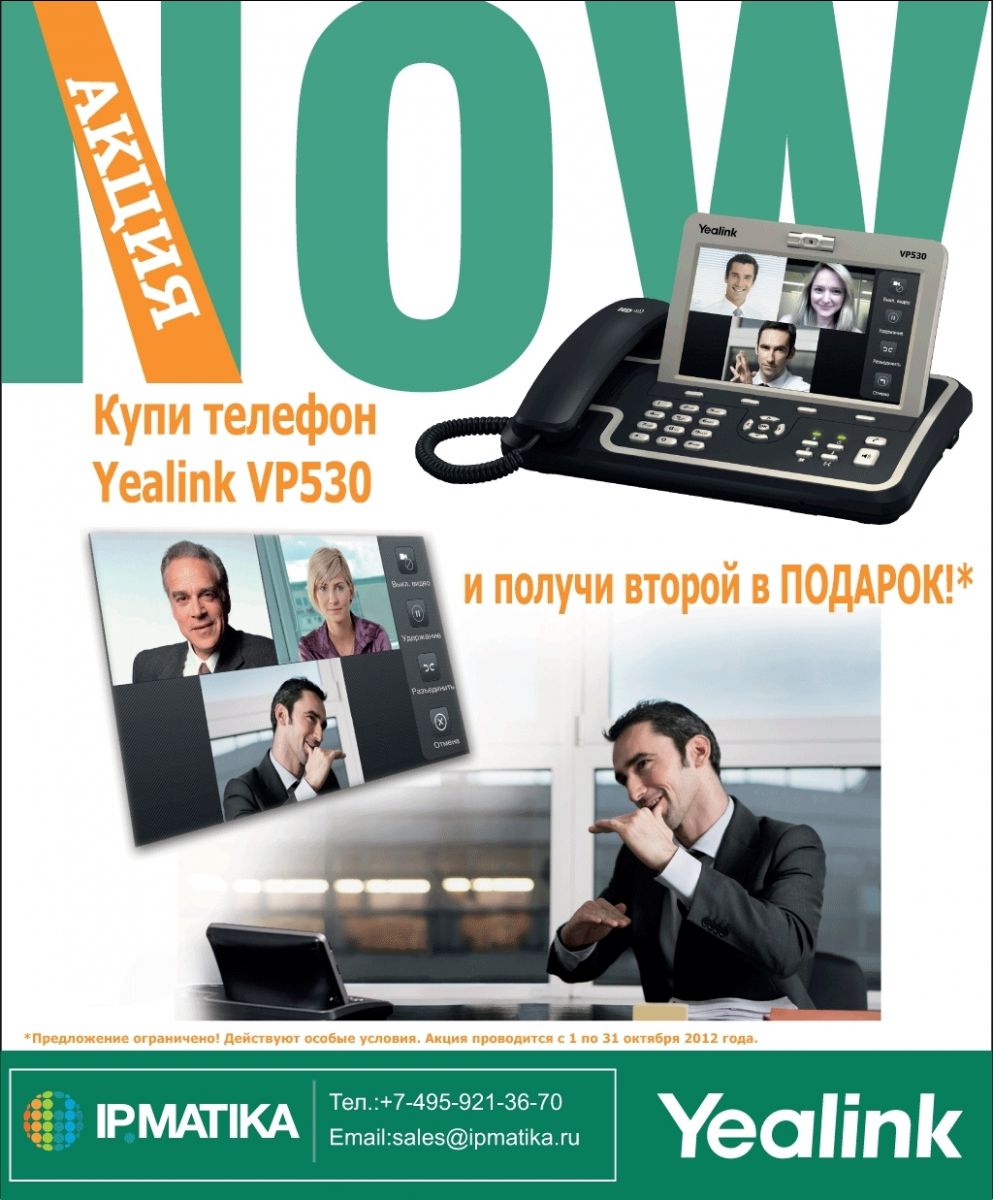 Компания «АйПиМатика» объявляет о начале проведения акции для своих партнеров! В течение октября 2012 года при покупке телефона Yealink VP530 второй телефон Вы получаете бесплатно! Цель данной акции - знакомство с новинкой компании Yealink Network Technology Co., LTD