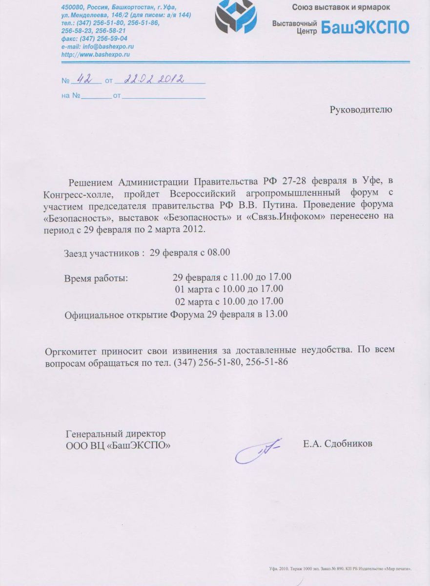 В связи с решением Администрации Правительства РФ о проведении Всероссийского агропромышленного форума с участием председателя правительства РФ В.В. Путина 27-28 февраля в г.Уфе, в Конгрес-холле, форум "Безопасность" , выставки "Безопасность" и "Связь.Инфоком" перенесены на период с 29 февраля по 2 марта 2012г.
