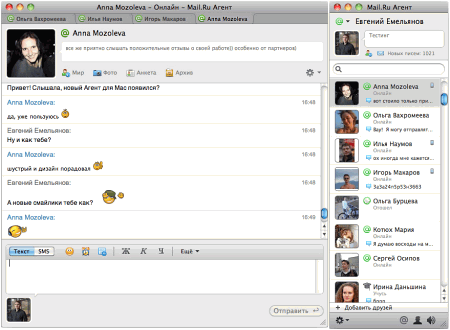 Помимо стильного дизайна, новая версия Mail.Ru Агента для Mac OS X порадует пользователей возможностью в режиме реального времени получать информацию о записях друзей в микроблогах, загруженных в Мой Мир@Mail.Ru фотографиях, видеороликах и музыкальных файлах. Функция «конференция» позволяет аудитории мессенджера общаться с несколькими собеседниками одновременно.