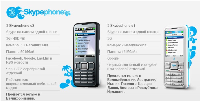 3 Skypephone – это полнофункциональный интернет телефон с поддержкой 3G и Skype. Благодаря этому телефону пользователи Skype смогут совершать бесплатные звонки и отправлять текстовые сообщения своим знакомым в любом месте действия сети оператора «3». Skypephone продается в Великобритании, Австралии, Австрии, Дании, Гонконге, Италии, Ирландии и Швеции.