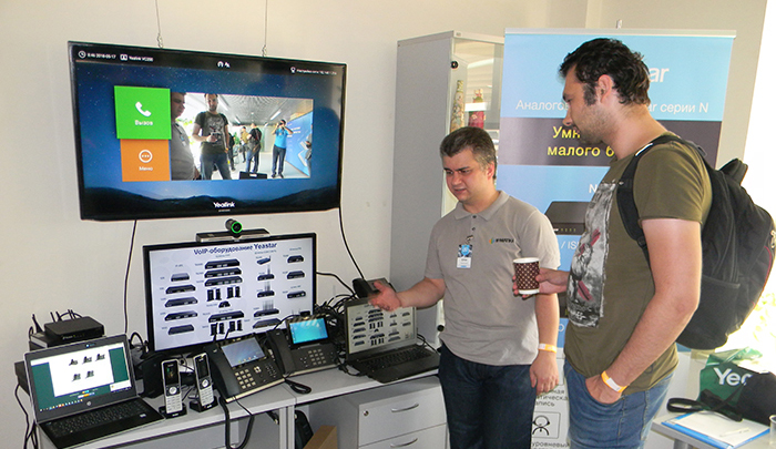 Компания АйПиМатика стала единственной, кто представил стенд с подключенным демо-оборудованием, где посетители смогли опробовать IP-телефоны Yealink, IP-АТС и шлюзы Yeastar, коммутаторы Wi-Tek. Внимание аудитории привлек терминал ВКС Yealink VC200 – бюджетное решение all-in-one для малых переговорных комнат.