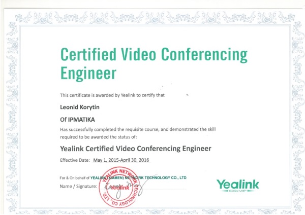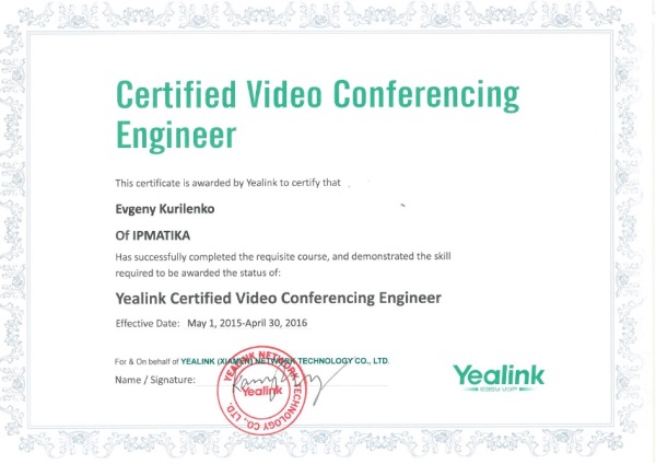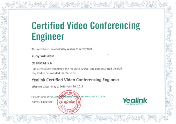 Компания Yealink сертифицировала сотрудников компании АйПиМатика, как инженеров по системам видео-конференц-связи Yealink