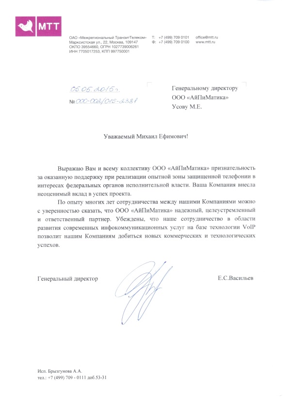 Получена благодарность за сотрудничество от ОАО "Межрегиональный Транзит Телеком". Нас ценят!