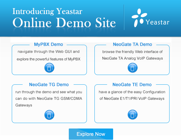 Компания Yeastar запустила долгожданный сервис Yeastar Online Demo Site, позволяющий пользователю в реальном времени на собственном опыте изучить и опробовать работу любого устройства, выпускаемого под маркой компании. Фактически, пользователю предлагается имитация интерфейсов серий IP-ATC MyPBX и шлюзов NeoGate с полным набором функций и возможностей, что значительно облегчает процесс подбора и тестирования оборудования перед покупкой. Теперь вместо того, чтобы смотреть вебинар, читать и обзор или брать девайс на тест, можно с этого демо-сайта поработать с любой интересующей вас АТС или шлюзом.