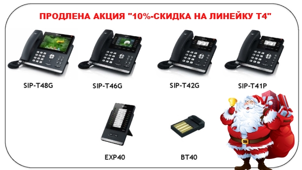 До конца 2014 года продлена акция на линейку телефонов Yealink T4 - скидка 10% на все модели линейки и блоки питания, а также аксессуары: Yealink EXP40 и Yealink BT40.