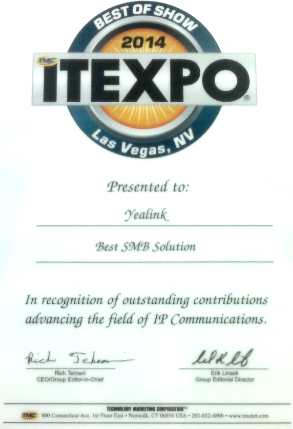 Компания Yealink награждена дипломом в номинации «Лучшее решение для малого и среднего бизнеса» в рамках церемонии награждения Best in Show Awards на всемирной выставке ITEXPO, проходившей с 11 по 14 августа 2014 года в гостинице «Рио» в Лас-Вегасе, США.