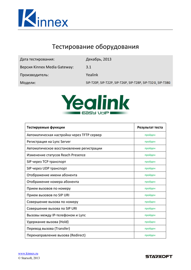 В конце 2013 года завершилось тестирование на совместимость IP-телефонов Yealink моделей SIP-T20P, SIP-T22P, SIP-T26P, SIP-T28P, SIP-T32G, SIP-T38G с Kinnex Media Gateway. Тестирование проводилось по 16 основным критериям и по каждому из них показало положительный результат. Принимая во внимание широкий ряд моделей, прошедших тестирование, можно утверждать, что и другие модели SIP-телефонов Yealink также полностью совместимы с Kinnex Media Gateway.
